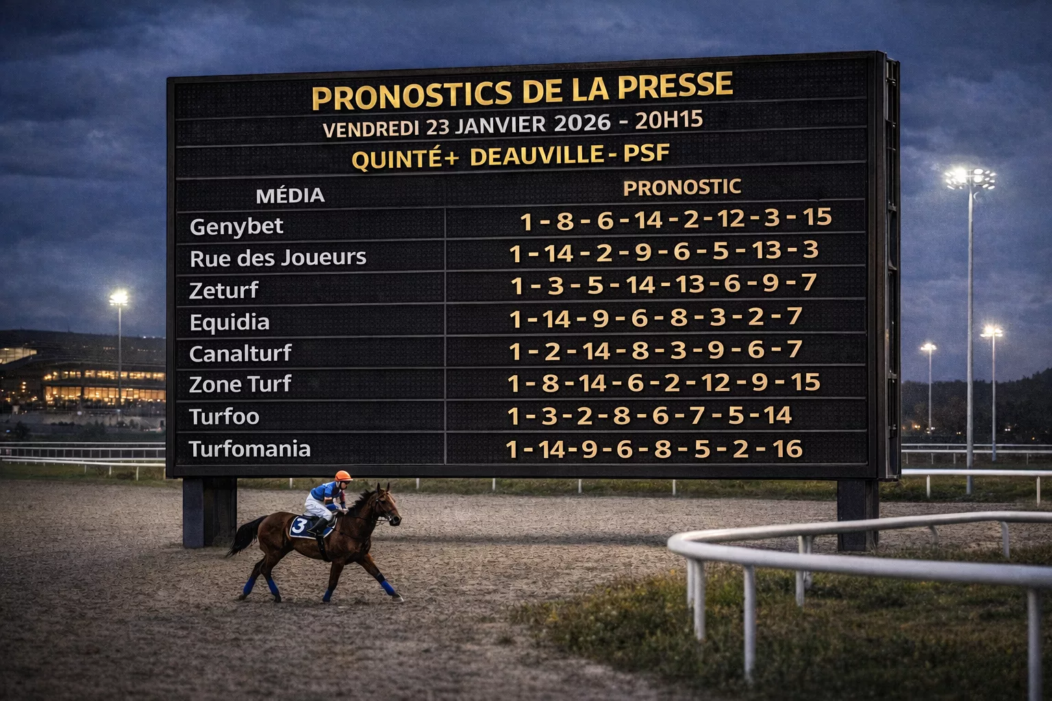 Le Tiercé Quarté Quinté+ du vendredi 23 janvier 2026 se disputera en nocturne à 20h15 sur l’hippodrome de Deauville, dans le cadre du Prix de Cherbourg, un handicap divisé de Classe 2 réservé à des chevaux d’âge. Cette épreuve, très attendue par les parieurs, se déroule sur les 1.900 mètres corde à droite de la PSF, un tracé où le placement et la capacité d’accélération finale font souvent la différence. Dans ce contexte assez indécis, Fréquence Turf a réalisé une synthèse complète des meilleurs pronostics de la presse afin d’identifier les grandes tendances du quinté. […]